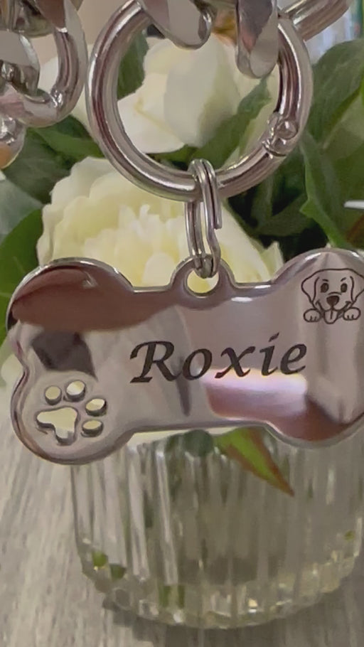 ◆ Model Info ◆ ◆ Font shown on tag: Font #19 – Banana◆ Dog model is wearing 36mm (small) engraved bone shaped tag ✨ Luxury Dog & Cat Chain Co...